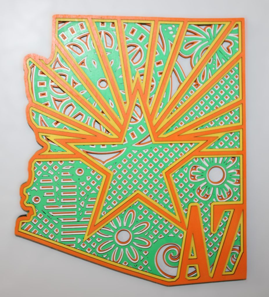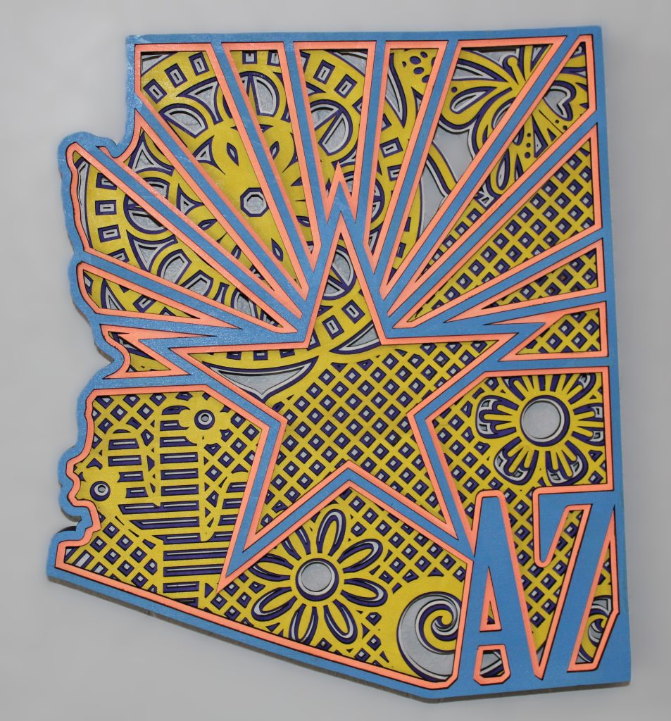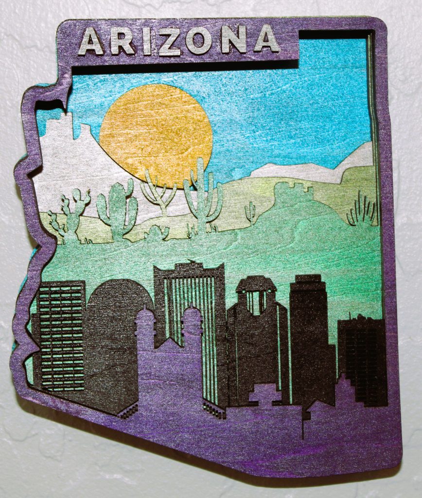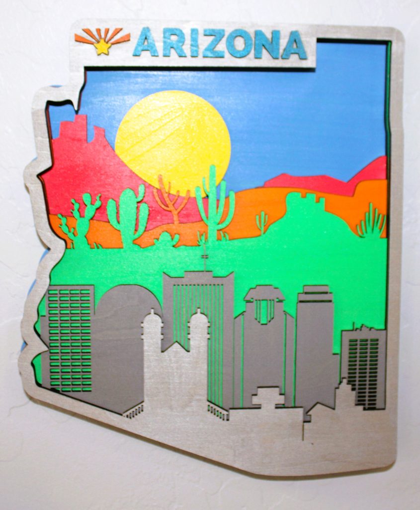 Item 17-B from our Geographic Art collection: Arizona State Sign with City – 5″t with 6 layers of wood. An eye-catching item that enhances your collection.