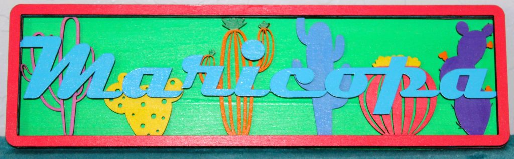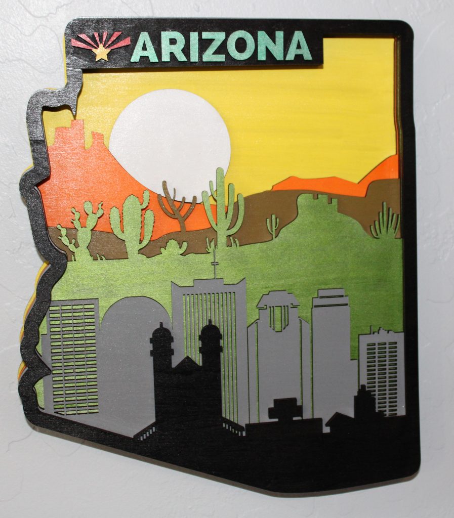 Item 17-B from our Geographic Art collection: Arizona State Sign with City – 5″t with 6 layers of wood. An eye-catching item that enhances your collection.